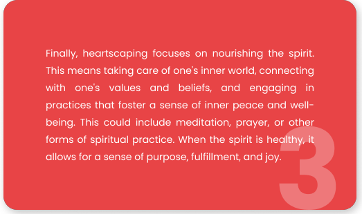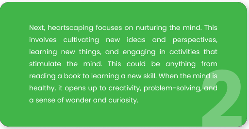 However, achieving this kind of personal ecology can be a daunting task. In the hustle and bustle of everyday life, it can be easy to neglect one’s own needs and focus solely on external demands. Your family’s needs or your career for example are some of these demands in life. That’s where heartscaping comes in – a holistic approach to life that nurtures the self in all its aspects, including the body, mind, and spirit.